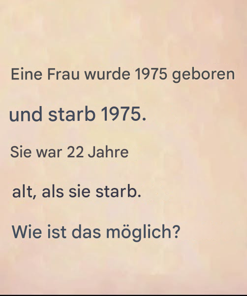 Stellen Sie sich Folgendes vor: Sie stoßen beim Überprüfen Ihres Nachrichtenfeeds auf diesen seltsamen Satz: "Eine Frau wurde 1975 geboren und starb 1975. Ich war 22 Jahre alt." Es lähmt dich. Unverständlich? Beunruhigend? Sicherlich gibt es noch etwas... Aber wo ist der Haken? Halte dich gut fest, denn dieses Dilemma widerspricht unserer Logik, unseren automatischen Reaktionen, und erfordert ein wenig Fantasie. Was, wenn der Schlüssel genau darin bestand, nicht so zu denken wie sonst?