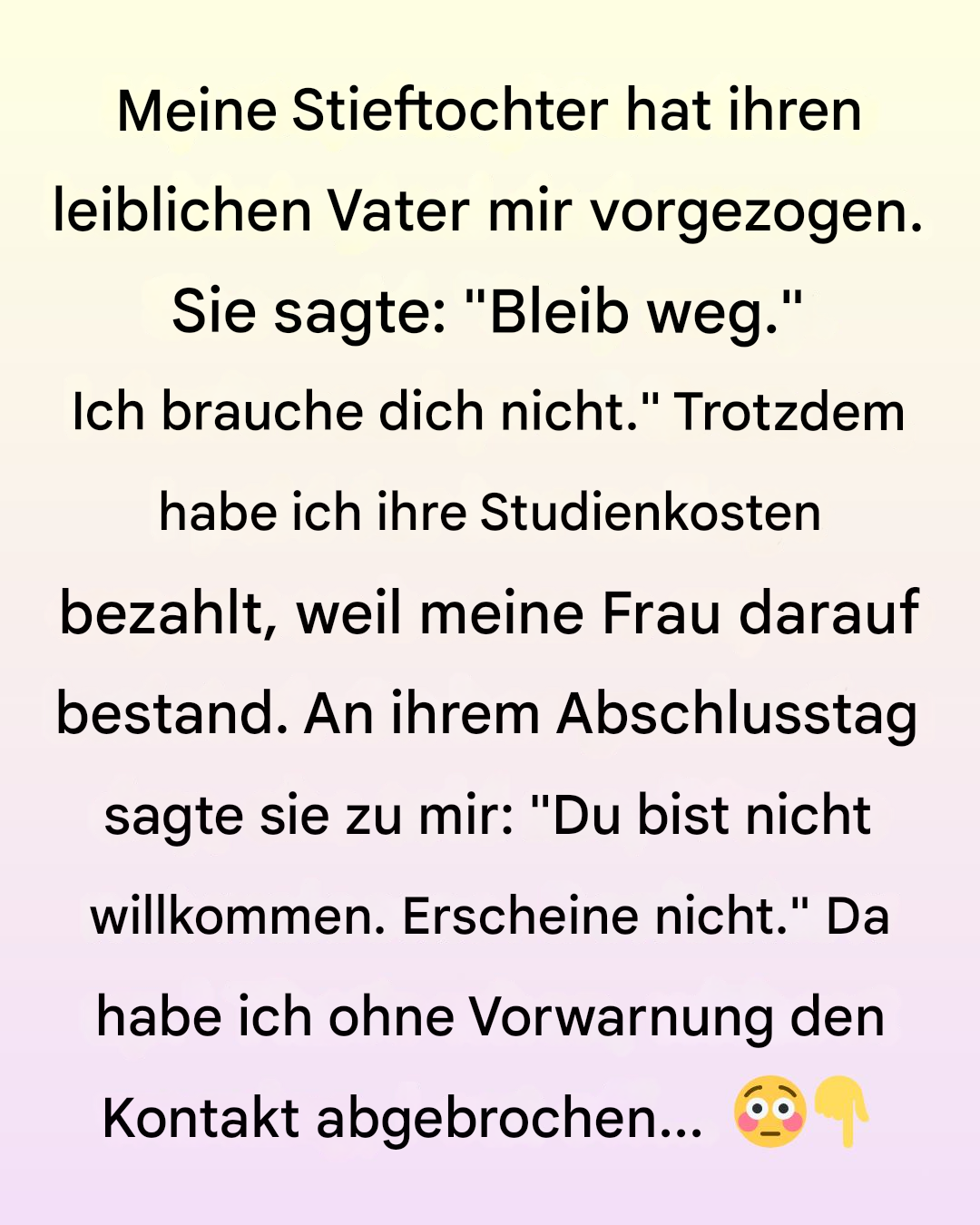 Ich weiß gar nicht, wo ich anfangen soll, aber nun gut. Von Anfang an machte meine Stieftochter deutlich, dass sie ihren leiblichen Vater mir vorzog. Sie sagte mir einmal direkt ins Gesicht: „Geh weg. Ich brauche dich nicht.“ Das tat weh, aber ich akzeptierte es.